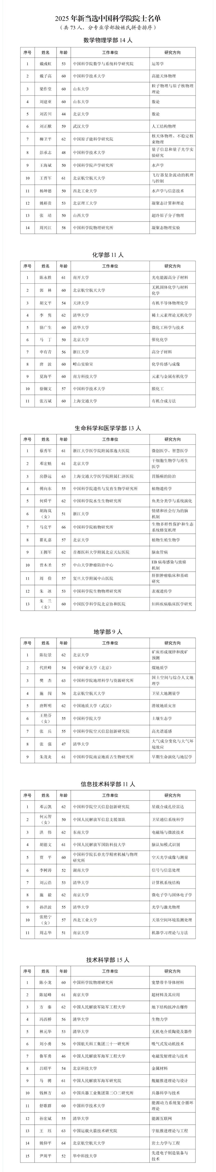 中国科学院、中国工程院21日公布2025年院士增选结果,分别选举产生中国科学院院士73人,中国工程院院士71人。