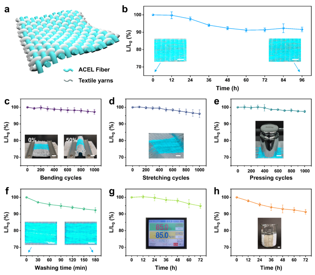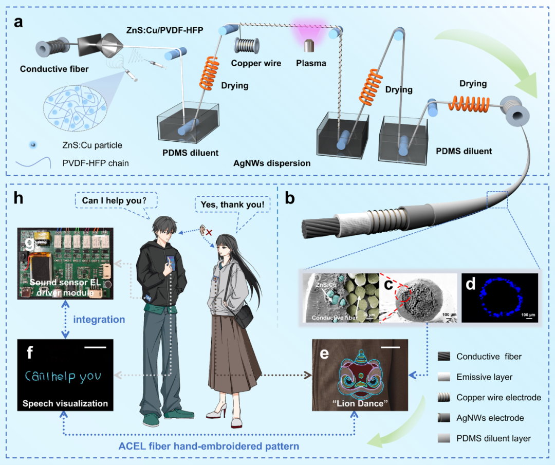 近期,浙江理工大学胡毅教授团队在Advanced Fiber Materials上发表了题为“Fluorescent Dye-Enhanced ACEL Fibers for Omnidirectional Luminescence and Voice-Interactive Human-Machine Interfaces”的研究成果。 该工作通过结合共轭电纺和溶液浸涂技术连续制备工艺,构建出多色交流电致发光(ACEL)纤维器件。将ACEL纤维与具备语音和音量识别功能的声音传感驱动模块集成在一起,从而扩大其在听障人士通信、高噪声环境预警和医疗呼吸声监测等领域的潜在应用,为可穿戴光电系统、交互纺织与多功能电子纺织平台开辟新路径。 如图1所示,ACEL纤维的连续制造融合共轭电纺与溶液浸涂技术,包括6个关键步骤:(I)共轭静电纺丝成形发光层,(II)浸涂介质层,(III)包缠铜丝外电极,(IV)等离子体表面改性,(V)浸涂银纳米线(AgNWs)外电极,(VI)浸涂封装层。 图1 基于ACEL纤维的声音传感显示系统的设计、制造及集成 如图2所示,该工作在团队前期多色平面柔性ACEL器件的基础上,进一步于原始ACEL纤维的ZnS:Cu/PVDF-HFP发光层表面浸涂荧光染液,构筑颜色转换层,实现多色发射并提升光谱输出。该策略为荧光染料增强型多色ACEL纤维的连续化与批量化生产提供了新路径。 图2 ACEL纤维的颜色调节特性 图3系统表征了无颜色转换层ACEL纤维在不同驱动电压和频率下的电致发光特性。ACEL纤维的电致发光亮度随交流电压和驱动电压频率的提升而显著增强;同时,频率升高使EL光谱明显蓝移,实现绿到蓝的可见变色,该现象在含颜色转换层的ACEL纤维中亦同步出现。 图3 ACEL纤维的发光性能 如图4所示,为评估ACEL纤维的可加工性和织物集成度,研究织造出平纹ACEL织物;平纹结构使纤维均匀分布,在机械变形下仍保持电致发光稳定。经系列耐久性验证,其机械与环境稳定性契合可穿戴电子纺织品需求。 图4 ACEL织物的稳定性 如图5所示,为进一步探索ACEL纤维的多功能性和色彩多样性,研究采用传统编织和手工刺绣技术,制作出“吉祥结”“ZSTU”“醒狮”等发光显示图案,并手工刺绣成文本类图案,随后耦合声音传感EL驱动模块集成,构筑声音传感显示系统。该系统借助驱动模块的英语语音识别和声音分贝检测功能,可有效将准确识别的声音信号转换为视觉反馈,适配多场景应用。 图5 ACEL纤维在智能纺织品和交互系统中的应用