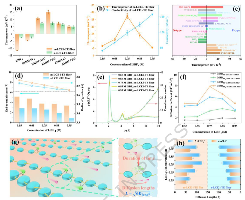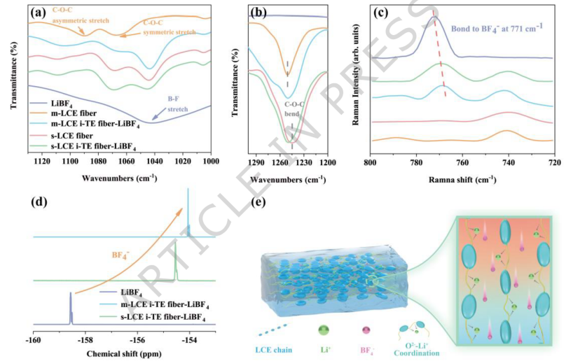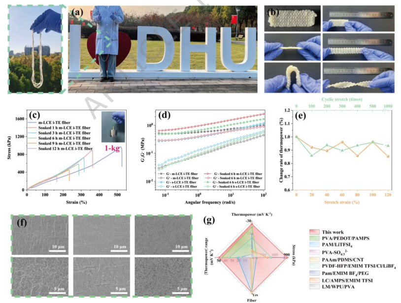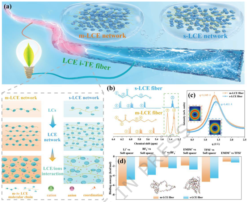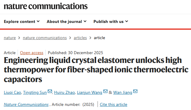 近日,东华大学江莞教授、王连军教授、孙婷婷博士合作通过工程化液晶弹性体的分子结构,成功研制出兼具高性能p型与n型特性的离子热电纤维。该工作通过将液晶弹性体从侧链结构设计为主链结构,并仅使用单一离子源(LiBF₄或EMIM TFSI),在低于30%的相对湿度下实现了目前同系材料中最大的p-n可调跨度(28.8至-27.4 mV K⁻¹)。基于此,团队成功集成出均质的π型纤维状离子热电电容器,仅需2.5 K的微小温差,三对p/n单元即可输出402.5 mV的电压,单根n型纤维的面能量密度达到8.1 mJ m⁻²。这项研究为开发高效、稳定、实用的柔性电子与智能可穿戴设备热-电荷储能系统提供了新思路。 相关论文以“Engineering liquid crystal elastomer unlocks high thermopower for fiber-shaped ionic thermoelectric capacitors”为题,发表在Nature Communications上。 研究团队首先从分子网络设计入手。他们设计并合成了两种不同结构的液晶弹性体纤维:主链型液晶弹性体(m-LCE)和侧链型液晶弹性体(s-LCE)。核磁共振氢谱和二维广角X射线衍射分析证实,m-LCE具有更有序的分子排列和更大的分子间距,这为离子迁移提供了更宽敞的通道。理论计算表明,m-LCE网络中的醚键(C-O-C)与锂离子(Li⁺)之间具有更强的结合能,有助于促进阴离子(BF₄⁻)的迁移,从而为获得高n型热电势奠定了基础。 图1:实现高性能n型离子热电材料的工程化液晶弹性体设计原理。 (a) 纤维内部主链型(m-LCE)和侧链型(s-LCE)分子结构示意图。(b) m-LCE和s-LCE的核磁共振氢谱(溶剂:CDCl₃,频率:600 MHz)。(c) m-LCE和s-LCE的一维强度分布图。小图:m-LCE(左)和s-LCE(右)的二维广角X射线衍射图样。(d) 不同LCE架构中软链段与离子供体(Li⁺, BF₄⁻, EMIM⁺, TFSI⁻)以及Li⁺-BF₄⁻对、EMIM⁺-TFSI⁻对之间的结合能。 在性能测试中,研究证实了工程化网络结构的优势。无论是浸渍n型离子源LiBF₄还是p型离子源EMIM TFSI,m-LCE纤维的热电势均显著高于s-LCE纤维。经过优化,m-LCE纤维在低湿度条件下获得了-27.4 mV K⁻¹的创纪录n型热电势,以及28.8 mV K⁻¹的p型热电势,实现了56.2 mV K⁻¹的p-n跨度。分子动力学模拟从机理上揭示了性能提升的原因:m-LCE网络为离子提供了更长的扩散长度(Li⁺: 81 Å, BF₄⁻: 122 Å),且Li⁺与聚合物链的配位更强,从而显著增大了阴、阳离子的迁移率差异,驱动了高热电势的产生。 图2:热电性能与机理分析。 (a) 浸渍不同类型离子液体的m-LCE/s-LCE纤维的热电势。(b) m-LCE离子热电纤维在不同LiBF₄浓度下的热电势与电导率。(c) m-LCE离子热电纤维的p型和n型热电性能与文献报道(湿度低于70% RH条件下)的对比。(d) m-LCE/s-LCE纤维的末端距和回转半径随LiBF₄浓度的变化。(e) m-LCE离子热电纤维的径向分布函数和配位数。(f) 不同LiBF₄浓度下,m-LCE/s-LCE纤维中离子(Li⁺, BF₄⁻)的扩散系数(均方位移)。(g) 扩散长度(L)示意图。(h) Li⁺和BF₄⁻在m-LCE/s-LCE纤维中的扩散长度随LiBF₄浓度的变化。所有误差棒代表平均值±标准偏差,重复次数n=3。 图3:结构表征。 (a) m-LCE/s-LCE架构的傅里叶变换红外光谱局部图,突出C-O-C键的不对称伸缩振动。(b) m-LCE/s-LCE架构的傅里叶变换红外光谱局部图,突出C-O-C键的弯曲振动。(c) m-LCE/s-LCE架构中BF₄⁻的拉曼光谱。(d) m-LCE/s-LCE架构中氟原子的氟-19核磁共振谱(溶剂:CDCl₃,频率:600 MHz)。(e) m-LCE离子热电纤维中的配位机制示意图。 除了卓越的热电性能,m-LCE纤维还展现出优异的综合性能。该纤维具备良好的可编织性和机械弹性,断裂伸长率超过500%,并能承受1000次拉伸循环而保持热电性能稳定。动态力学分析证实其具有稳定的准固态凝胶特性和交联网络结构。扫描电镜和偏光显微镜观察进一步揭示了其单畴排列和各向异性特征,这种有序结构有利于离子迁移和热电性能的提升。 图4:综合性能评估。 (a) 户外条件下4米长m-LCE离子热电纤维的现场展示。(b) 纤维可编织性及织物在拉伸、弯曲或扭转下承载能力的演示。(c) m-LCE离子热电纤维在不同浸渍时间下的应力-应变曲线(小图显示提起1公斤重物的实物图)。(d) LiBF₄浸渍前后m-LCE和s-LCE架构的动态力学曲线。(e) m-LCE离子热电纤维在不同机械条件下(单次拉伸0-120%及循环变形0-1000次)热电势的变化。(f) m-LCE纤维在LiBF₄溶液中浸渍0小时、6小时和12小时后的扫描电镜照片。(g) m-LCE离子热电纤维在四个方面的雷达图:n型热电势、机械性能、纤维可加工性及可用热电势跨度。 基于高性能的m-LCE纤维,研究团队成功构建了纤维状离子热电电容器和π型器件。电容器展现出清晰的四阶段工作特性,在1 MΩ负载下实现了8.1 mJ m⁻²的面能量密度。由三对p-n单元构成的π型器件,其单位温差输出电压高达146.8 mV K⁻¹。此外,团队还将纤维集成到织物中,制作了平面和三维可穿戴热-电荷器件,在接触人体或冷热源时能快速产生稳定的电压输出,展示了其在可穿戴设备和低品位热能收集方面的应用潜力。 图5:离子热电器件的电容与传感性能。 (a) 离子热电电容器工作模式示意图。(b) 由n型m-LCE离子热电纤维集成的离子热电电容器的电压-温差曲线。(c) 第二阶段(插图:第四阶段)在不同负载下的热电压。(d) 不同负载电阻下离子热电电容器的能量密度。(e) 由五根n型m-LCE离子热电纤维集成的器件的电压-温度曲线。(f) 由不同数量p-n对集成的π型器件的单位温差输出电压(ΔV/ΔT)。(g-h) 平面/三维结构热-电荷可穿戴器件的工作原理。(i) 平面器件