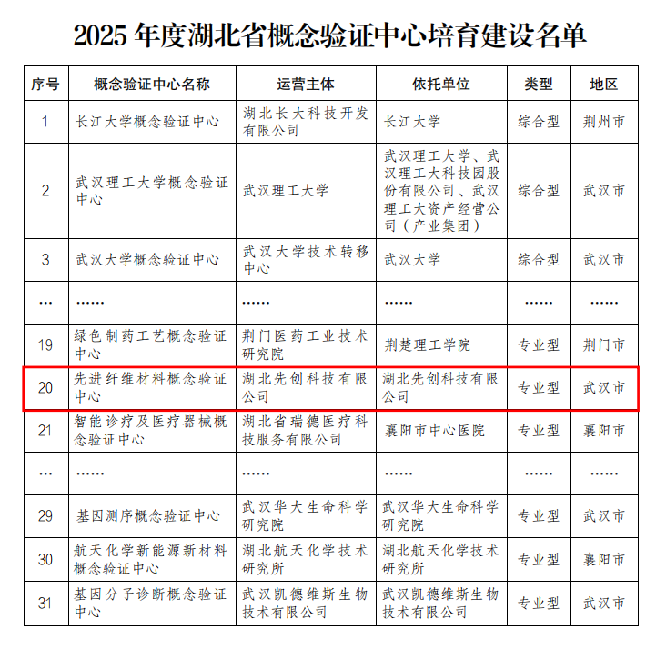 日前,根据《湖北省概念验证中心管理暂行办法》和《关于组织开展2025年度湖北省概念验证中心认定工作的通知》要求,经运营主体申报、地方推荐、会议评审和实地核查等程序,湖北省先进纤维材料综合型技术创新平台(以下简称“先创平台”)成功获批建设湖北省级概念验证中心——“先进纤维材料概念验证中心”。