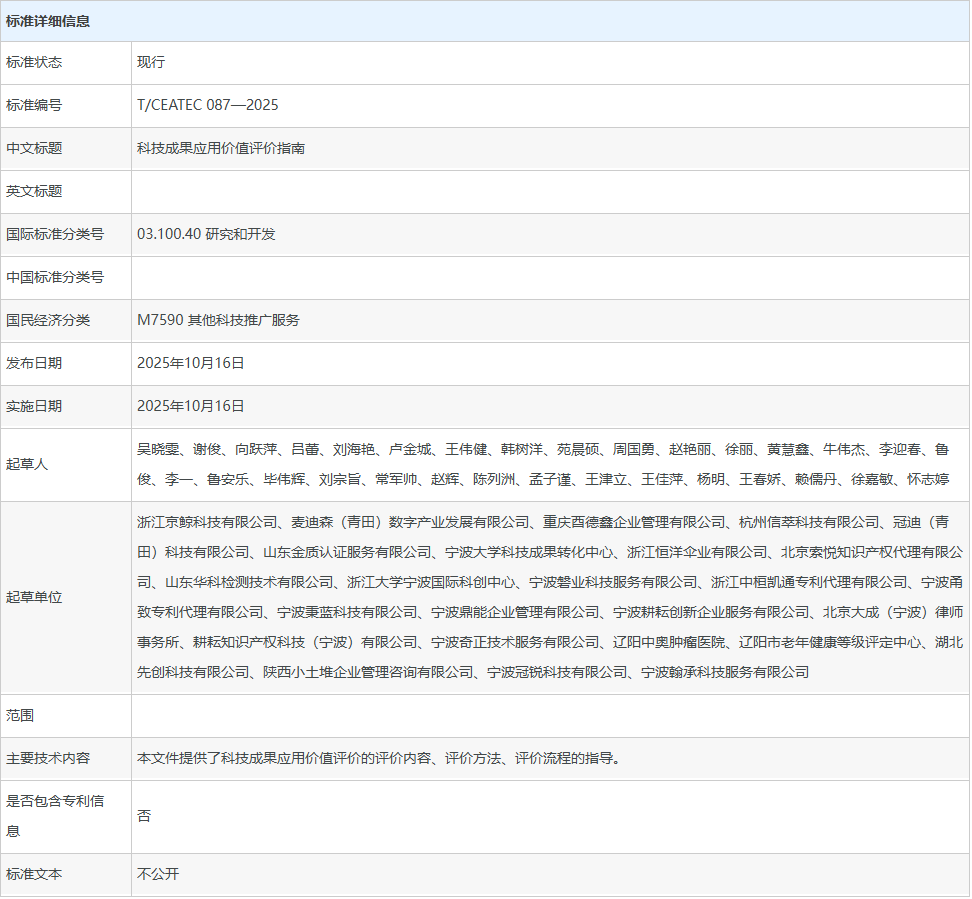 近日,由湖北省先进纤维材料综合型技术创新平台(湖北先创科技有限公司)等二十余家单位共同制定的《T/CEATEC 087-2025 科技成果应用价值评价指南》在全国团体标准信息平台正式发布实施。这标志着先创平台成功实现从“经验驱动”向“标准驱动”的关键转型,为破解行业长期存在的科技成果转化“评价难、定价难、推广难”痛点,提供了科学的方法论依据与可落地的操作路径。